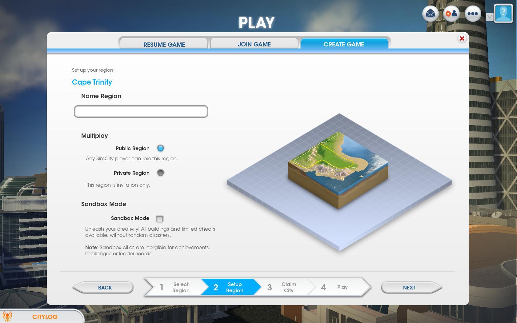 După acest bypass, aveți două opțiuni pentru a intra în “posesia” unui oraș. Prima opțiune este să vă creați o regiune nouă, cu câte slot-uri doriți și să alegeţi un mod de joc (sandbox sau normal). Modul sandbox oferă jucătorului un milion de Simoleons (unităţile monetare din joc) la începutul jocului și toate opțiunile deblocate, față de modul normal de joc care oferă doar 50.000 Simoleons pentru a clădi un oraș.
