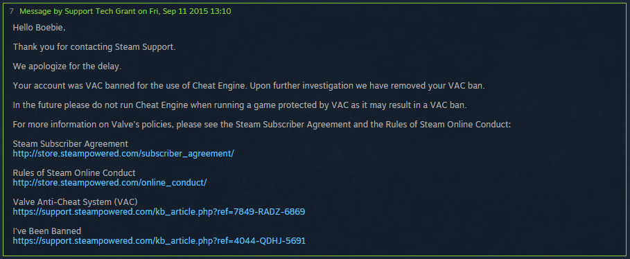 După ce a fost banat VAC, support-ul a decis să îi ridice acest ban. Lucru care nu se întâmplă aproape niciodată, ultima dată când Valve au decis că trebuie să ia măsuri a fost pe vremea lui Modern Warfare 2, când foarte mulți utilizatori au luat ban pe nedrept din cauza unei greșeli în sistemul VAC. Chiar mai mult, răspunsul a venit în doar o zi și contrazice complet ceea ce spune regulamentul în legătură cu ban-urile date de VAC: