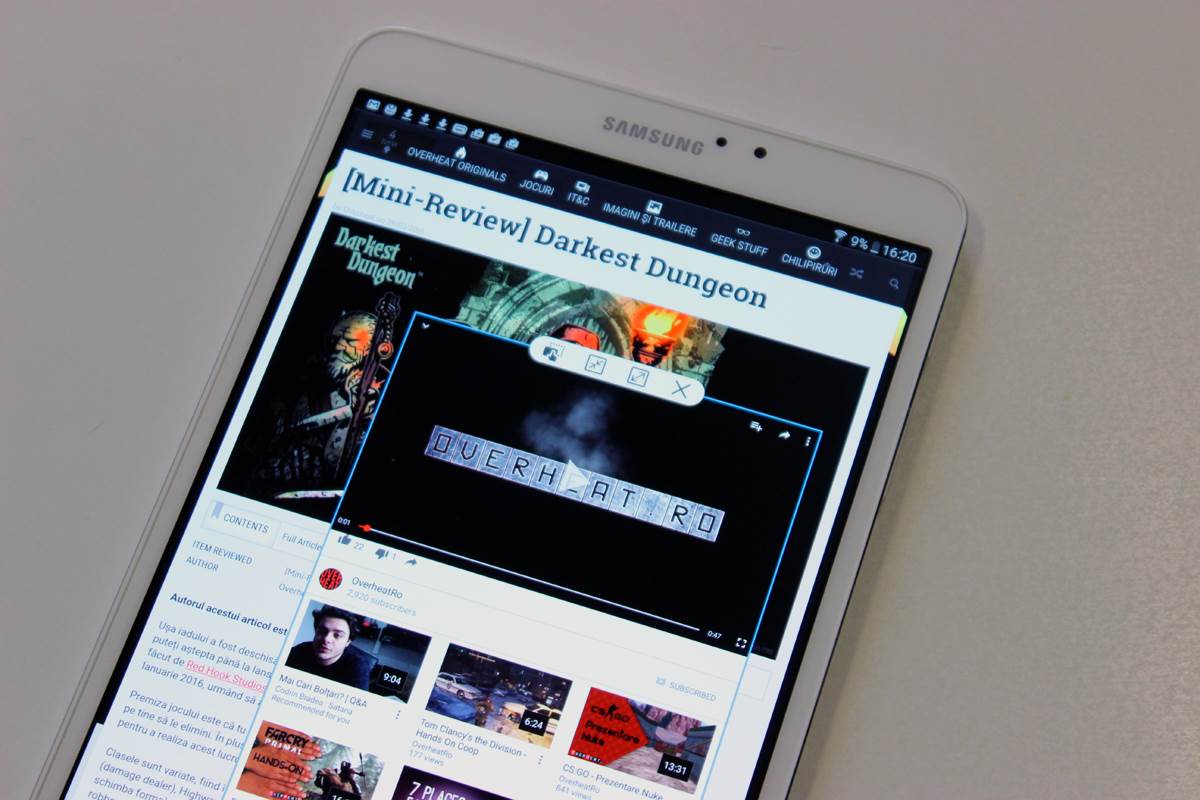 Multi Window permite vizualizarea a două aplicaţii în acelaşi timp, pe acelaşi ecran. De exemplu, în partea de sus poţi avea browser-ul, iar în partea de jos poate rula un clip de pe YouTube. Nu toate aplicaţiile sunt compatibile Multi Window, dar majoritatea aplicaţiilor care contează sunt. În acest moment, tableta din teste îmi spune că pot porni aceste aplicaţii în mod Multi Window: Chrome, Internet, My Files, CPU-Z, Galaxy Apps, Gallery, Email, Gmail, Hangouts, Maps, Memo, Music, Google Play Music, Youtube, Play Store, S Finder, S Planner, Skype şi Video.
