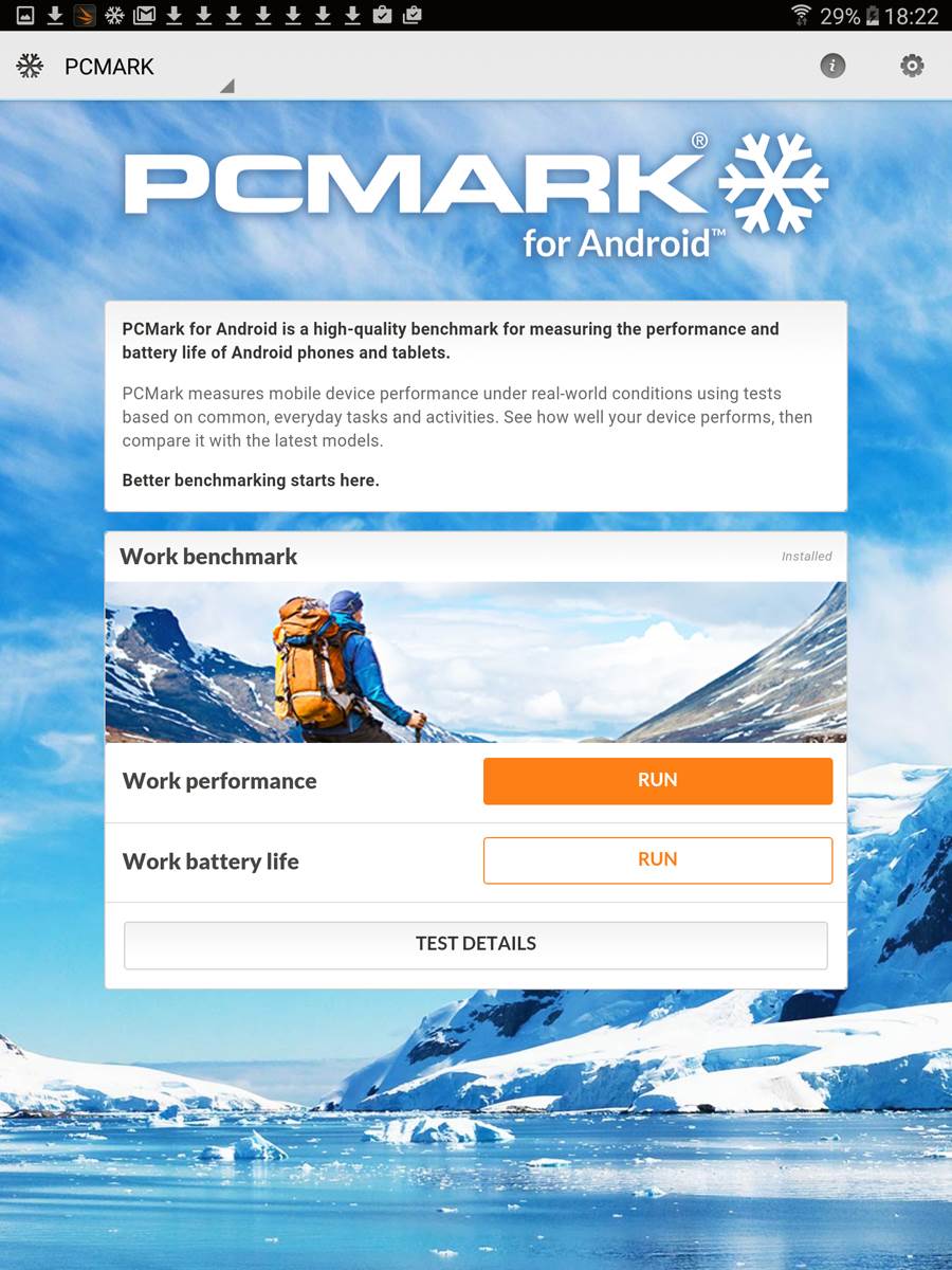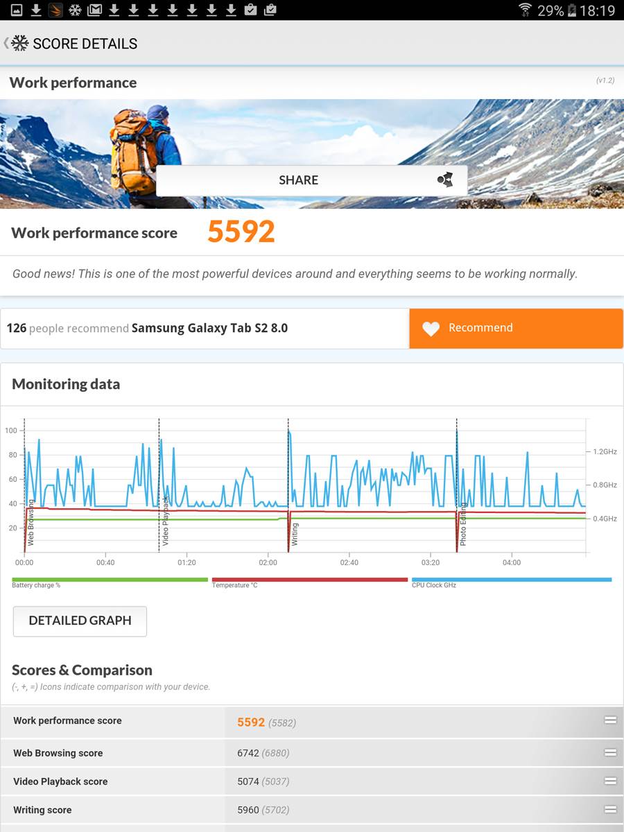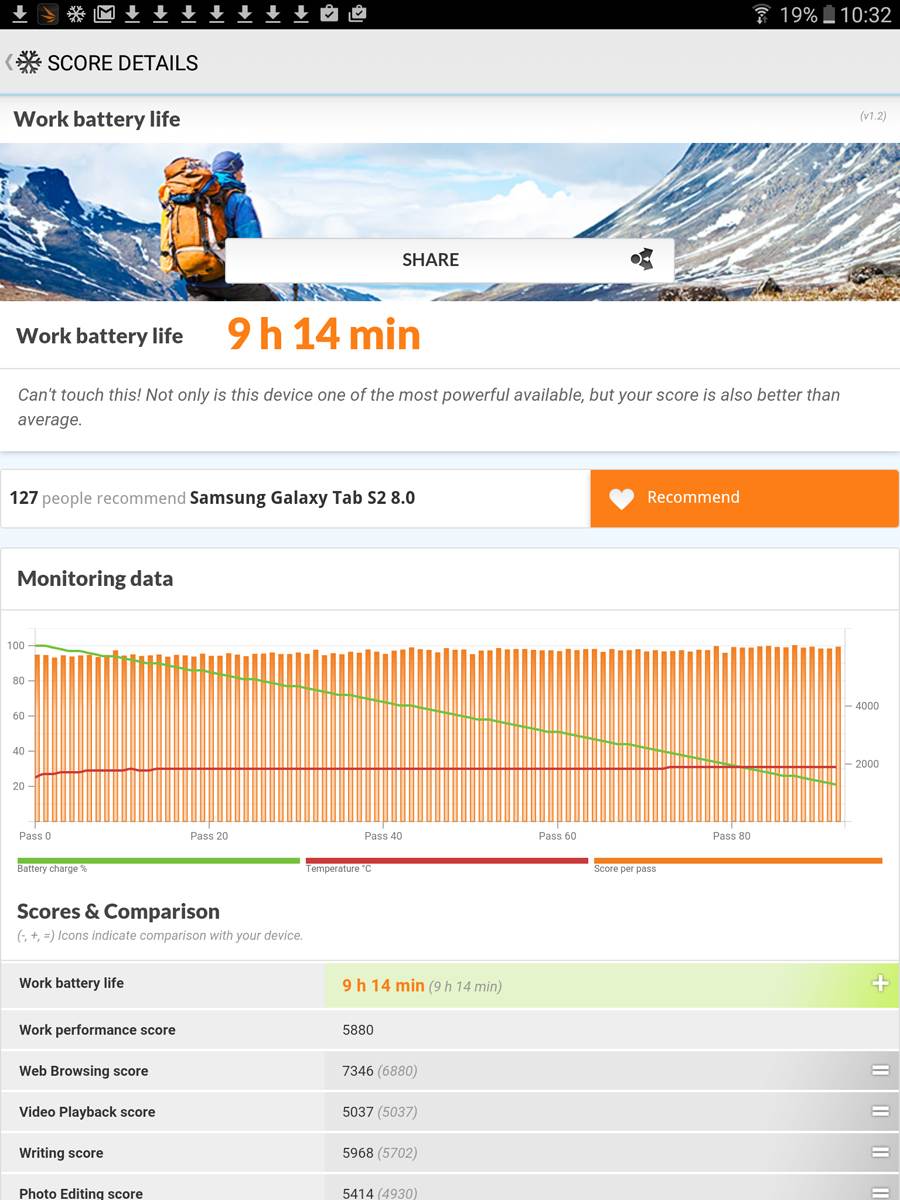 Bateria integrată în Tab S2 8” are o capacitate de 4000mAh şi s-a dovedit a fi foarte capabilă. În testul de baterie PCMark am obţinut un rezultat de 9 ore şi 14 minute, în condiţiile în care soft-ul simulează activităţi de browsing, playback video şi editare de fotografii şi text.
