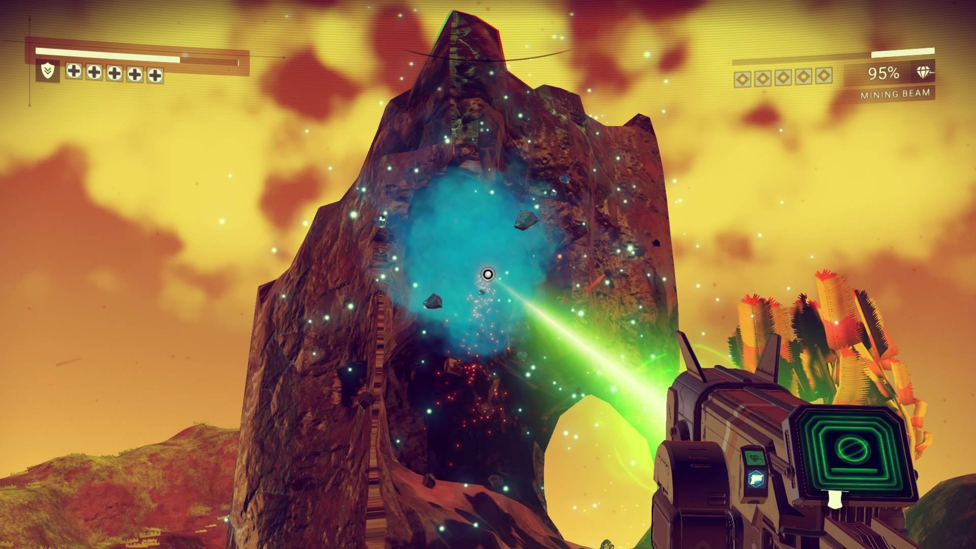 Gameplay-ul se împarte în două: exploratul la sol și navigarea spațială folosind o navă spațială. La sol, jucătorul dispune de un laser cutter care poate excava în anumite suprafețe pentru a extrage minereuri; de o armă laser care după cum v-ați aștepta servește pentru apărare și de un jet pack care ajută la deplasare. Deci mecanicile sunt minimaliste nu pot spune că nu funcționează optim. Țintitul cu armele laser este puțin stângaci, însă No Man’s Sky nu se bazează pe violență așa că nu vei folosi mai deloc acele arme.