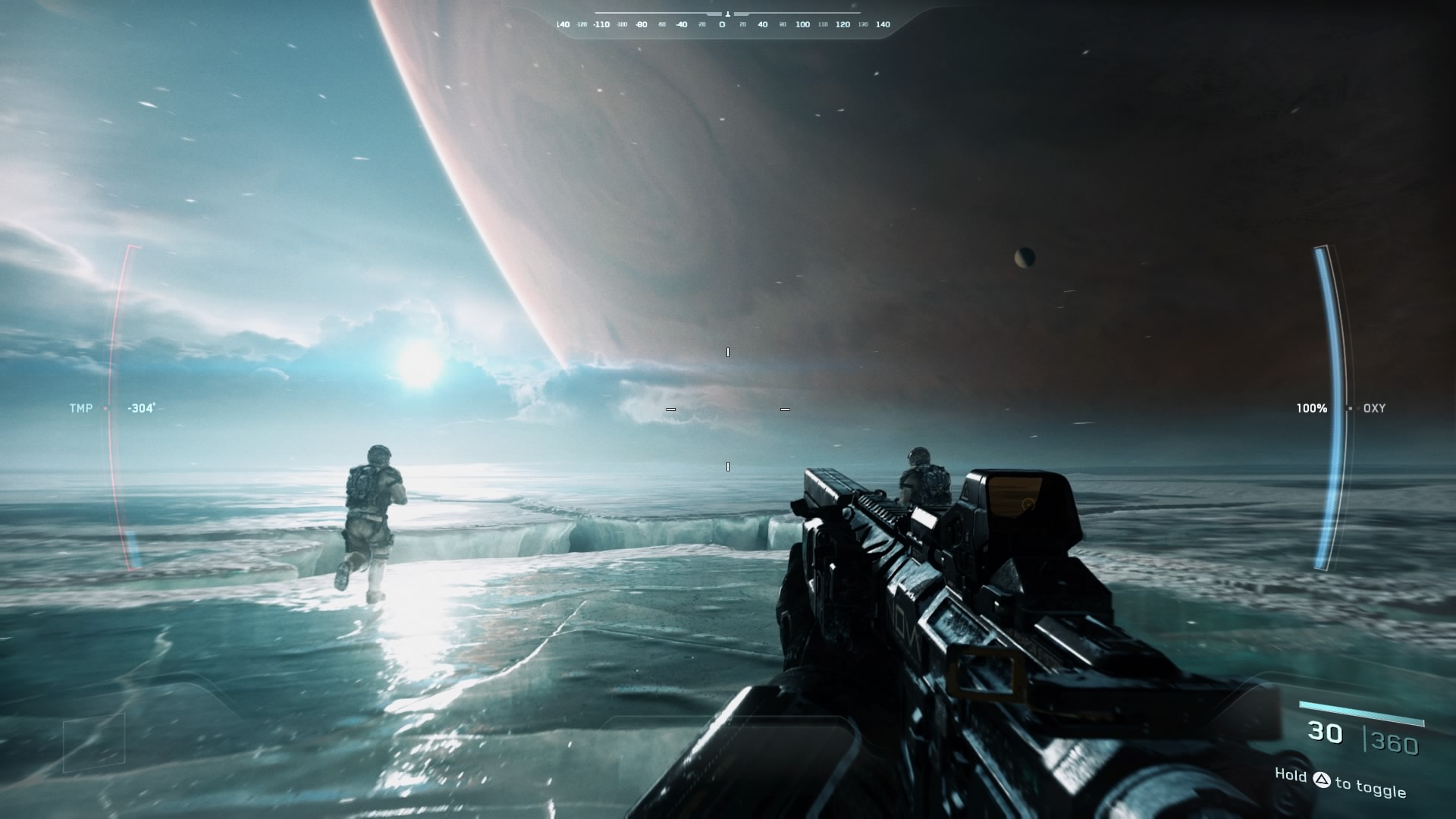 Din punct de vedere vizual, Infinite Warfare arată identic cu Black Ops 3: arme modelate atent, personaje detaliate și cutscene-uri CGI foarte bine animate. Pe de altă parte, noul Call Of Duty aruncă în fața jucătorului cele mai impresionante peisaje și medii de joc de până acum. Te vei lupta în spațiu în proximitatea variilor planete din Sistemul Solar, vei explora un asteroid și te vei târâ prin nămolul a numeroși sateliți naturali din spațiu. Este plăcut să împuști inamici în timp ce ai în fața ta, pe cer, inelele lui Saturn.