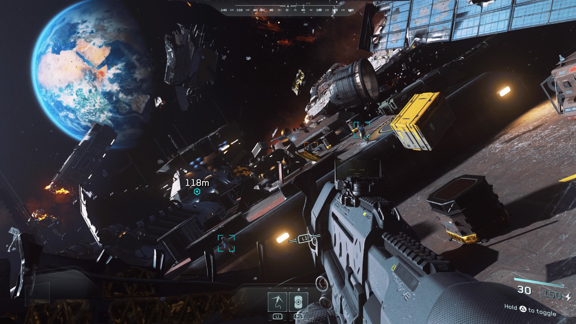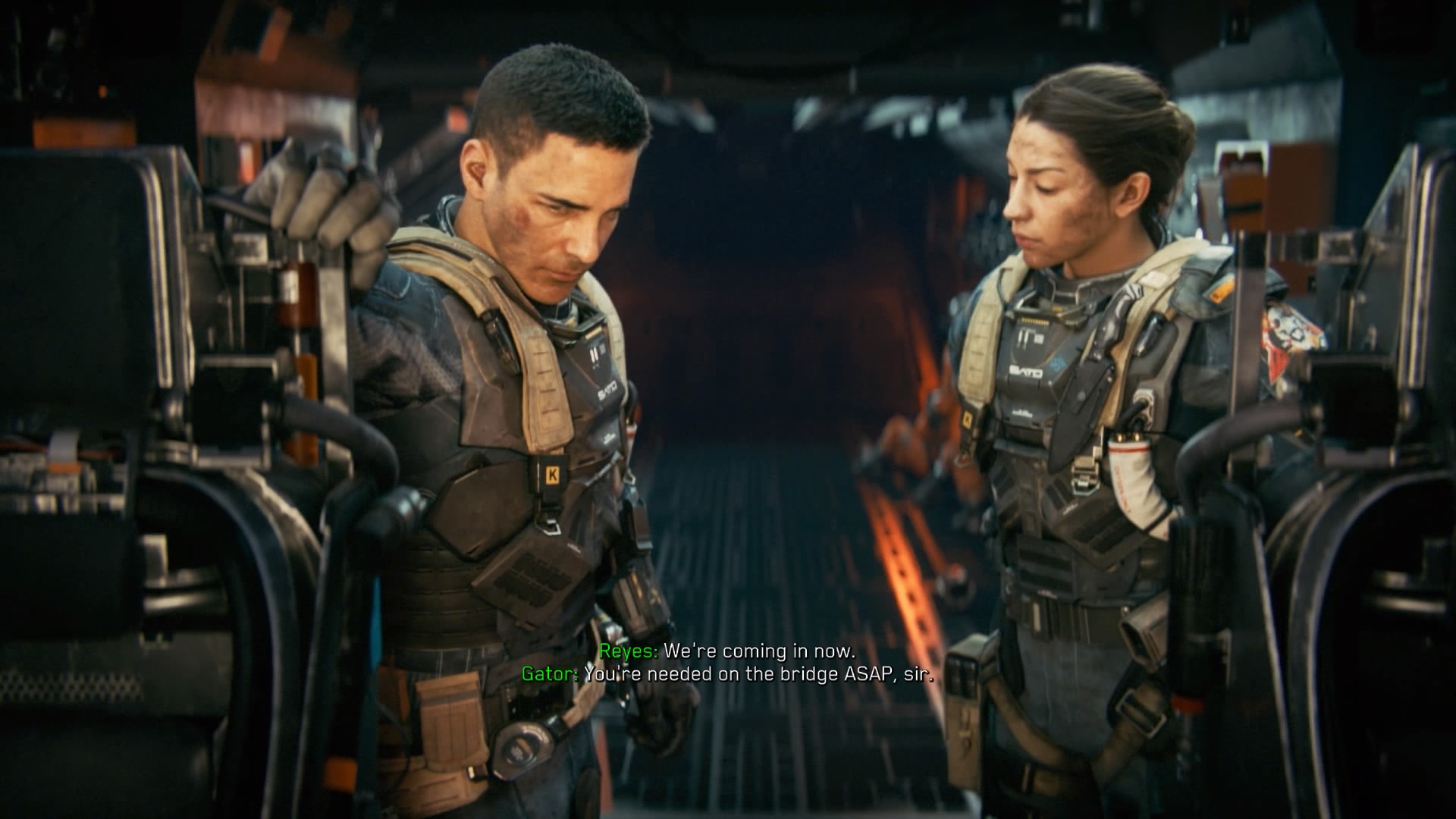 Probabil că vă întrebați: “Dar Silviu cum adică toate din interior? Vrei să spui că există și confruntări în exteriorul navei?” Ei bine.. Da!. Infinite Warfare are și confruntări armate zero gravitaționale în spațiu. Cu ajutorul unui cârlig special și al boost pack-ului din dotare, Reyes se poate deplasa prin spațiu în timp ce lichidează valuri de băieți răi. Aceste momente dau o verticalitate diferită nivelului și reușesc să diversifice considerabil modul de abordare al confruntării.