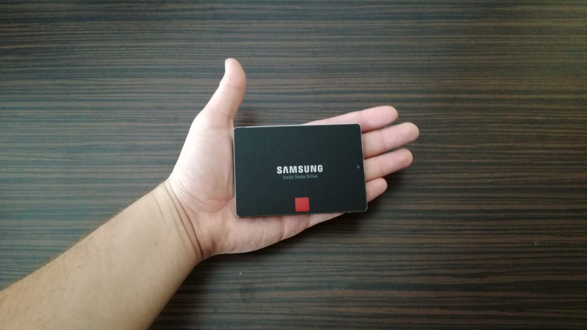 Cu o greutate de doar 90g și fiind o idee mai mic decât un telefon de 5″, Samsung 850 PRO este suficient de compact și performant cât să fie ascuns subtil în desktop, dar să ofere și un impact maxim. Carcasa exterioară este construită dintr-un metal plăcut la atingere, vopsit negru, cu o pată de culoare portocalie pentru design. Mai jos aveți o poză cu SSD-ul la mine în palmă (a se menționa faptul ca sunt un om cu mâini MARI) pentru a vă face o idee despre ce vorbesc.