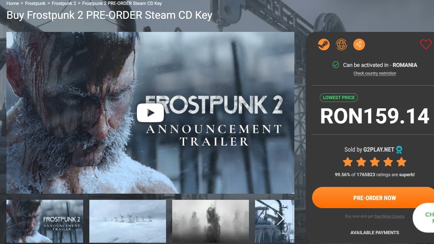 Ironia sorții face ca primul trailer al jocului să se încheie cu un individ despuiat îngenunchind în gerul ultimului oraș de pe Terra. Legat la mâini și însemnat în gudron cu „LIAR” pe piept, omul e pedepsit pentru suferința și promisiunile deșarte inspirate cetățenilor orașului. În aceeași manieră poate fi privit și vânzătorul de chei inexistente de Frostpunk 2 de pe Kinguin (listat la 160 de lei în momentul redactării).