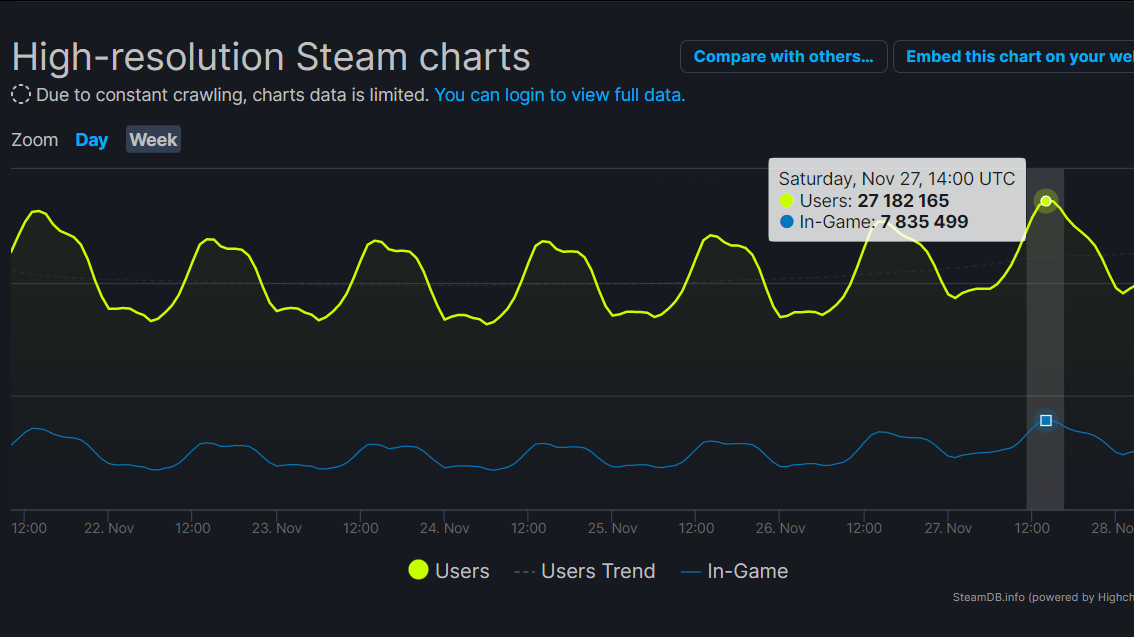Potrivit SteamDB, platforma lui Valve a atins un nou vârf istoric pe 27 noiembrie, în jurul orei (României) 17:00, cu 27.182.165 de utilizatori concomitenți. Da, pe data de 27 s-au conectat 27 de milioane, cum se cuvine.
