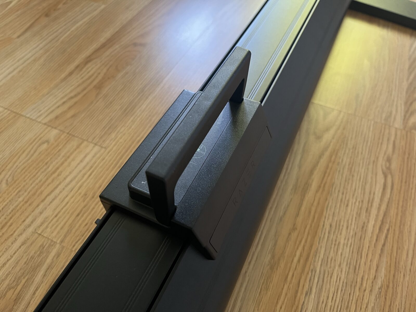 Am fost profund impresionat de calitatea construcției lui Razer Blue Screen. Este ca un tanc! Are un corp metalic extrem de solid, lucru pe care îl simți din plin atunci când ridici toate cele 7.5 kg ale produsului, care atunci când este pliat are dimensiuni de aproximativ 1.58m x 1.03m x 1.31m. Din fericire, transportarea este destul de ușoară, dat fiind că există un mâner situat la mijloc, care îți permite să transporți cu ușurință fundalul atunci când este strâns. Acestea fiind zise, mânerul în sine este realizat dintr-un plastic ușor, ceea ce contrastează cu restul produsului care pare heavy-duty. De aceea, parcă am avut un pic emoții când am ridicat 7.5kg cu acest mâner de plastic, dar îmi imaginez că e proiectat să fie mai rezistent decât pare.