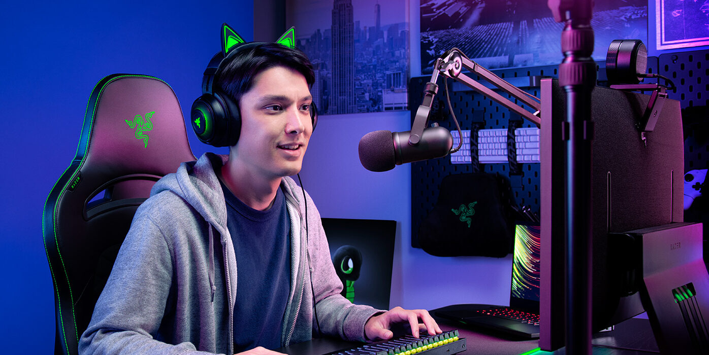 Ar fi fost total inutil un asemenea fundal pentru streamerii care folosesc periferice Razer, avand in vedere ca buna parte dintre produsele brandului au elemente verzi care ar fi devenit transparente daca fundalul retractabil ar fi avut aceeasi culoare. Imagineaza-ti cum ar fi aratat stream-ul acestui baiat pe un green screen (vezi foto dedesubt). Urechi transparente, elemente transparente pe scaun, căști gaming cu logo transparent. Meh, not the best look for a Razer fan! 🙂