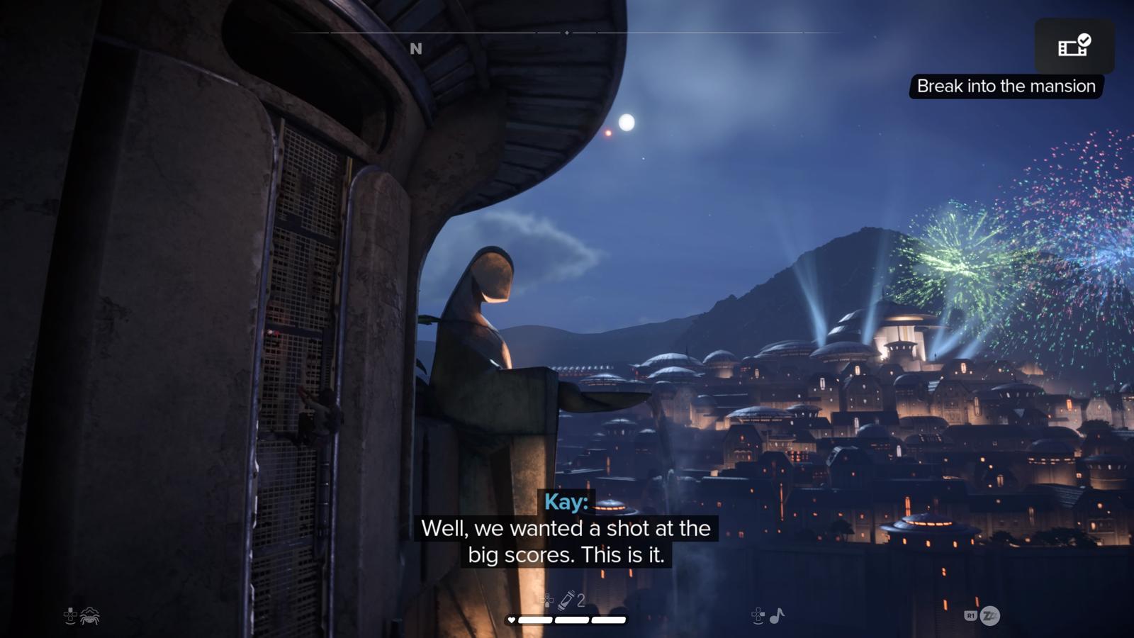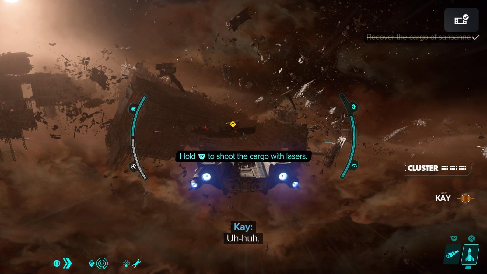 Pentru început, Kay primește un mesaj din partea unui bandit notoriu. Mesajul ne spune că trebuie să recuperăm un obiect sau o persoană. Kay se preface și spune “Da, știu să fac asta.” Evident, nu știe, dar totuși încearcă. Ne urcăm pe speeder sau alergăm până la locație. Ne dăm seama că nu putem împușca inamicii până la ușă așa că recurgem la stealth. Urmează partea de platforming, extrem de simplistă și lipsită de orice risc.