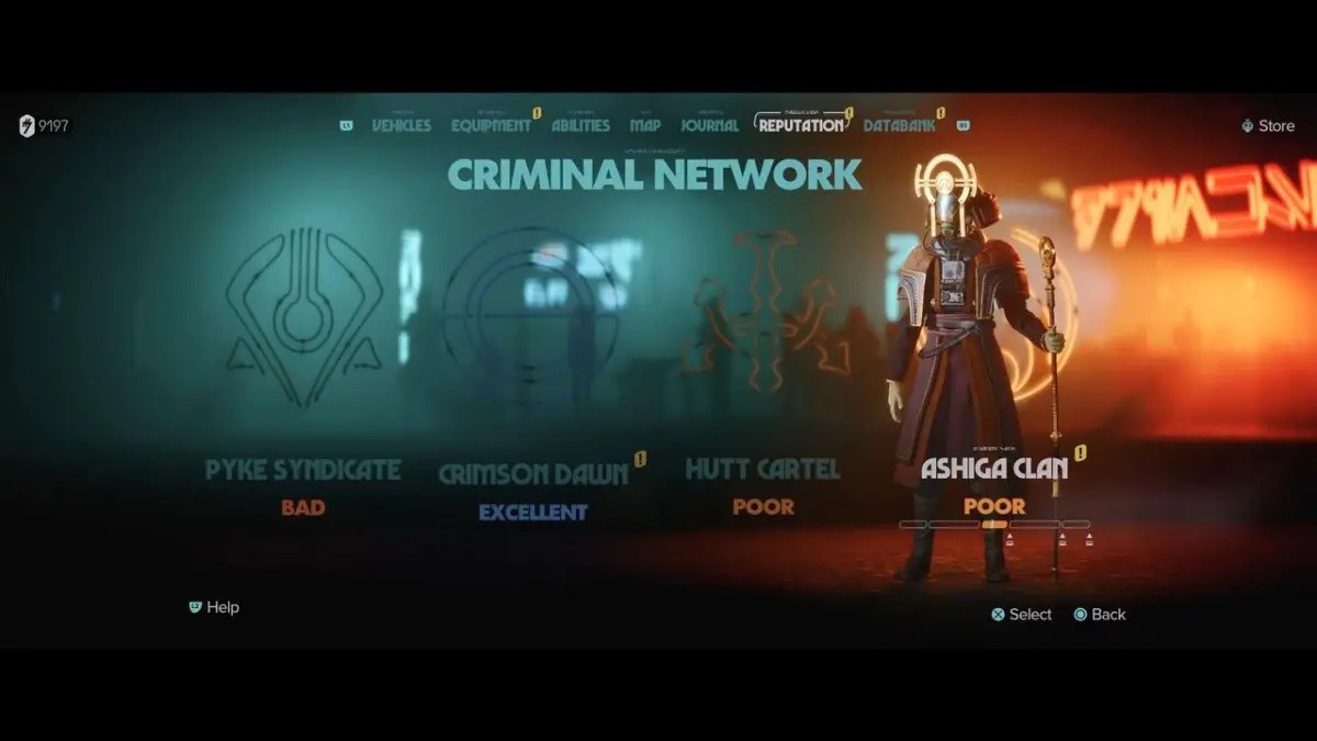 În Outlaws, putem face misiuni pentru oricare dintre cele 4 grupuri: Ashiga, Crimson Dawn, Hutts, Pykes. Aceste grupuri sunt imediat recognoscibile pentru fanii seriei. Fiecare grup are o personalitate bine stabilită, care din păcate este irosită. Alegerile pe care jucătorii le pot face au anumite repercusiuni, dar nu schimbă cu nimic lumea înconjurătoare.
