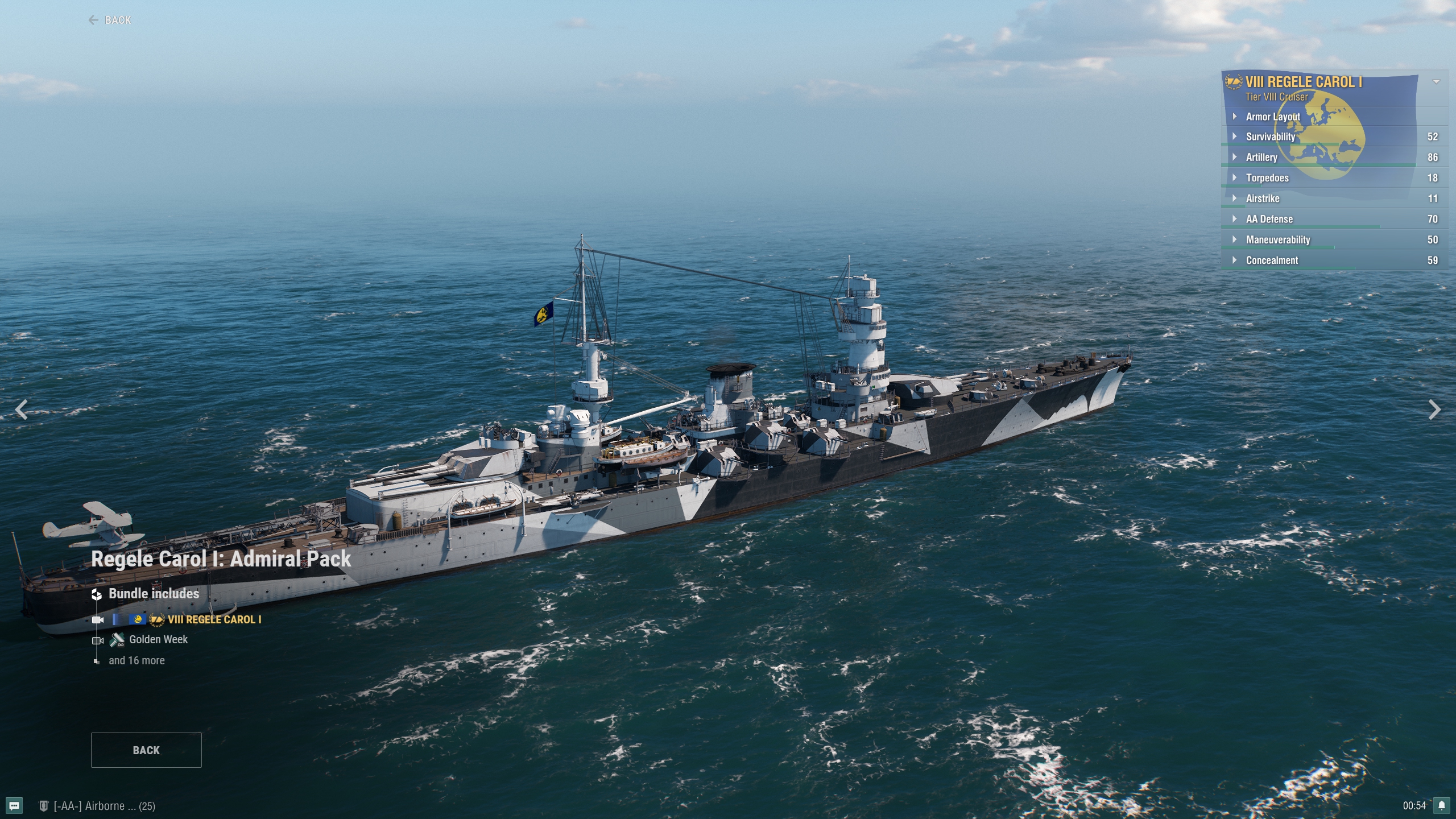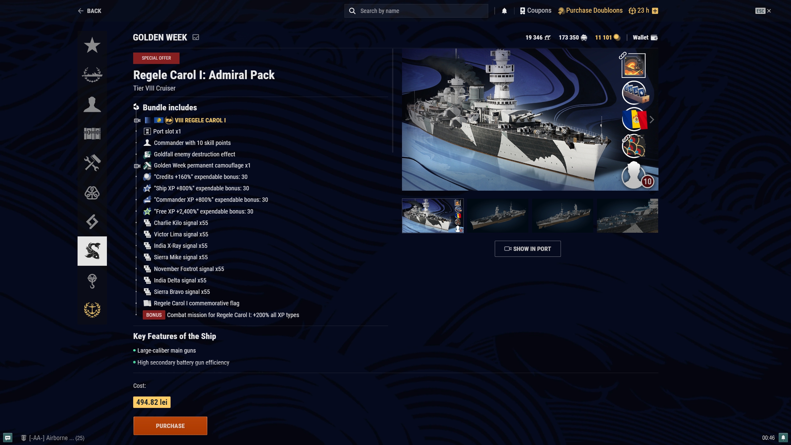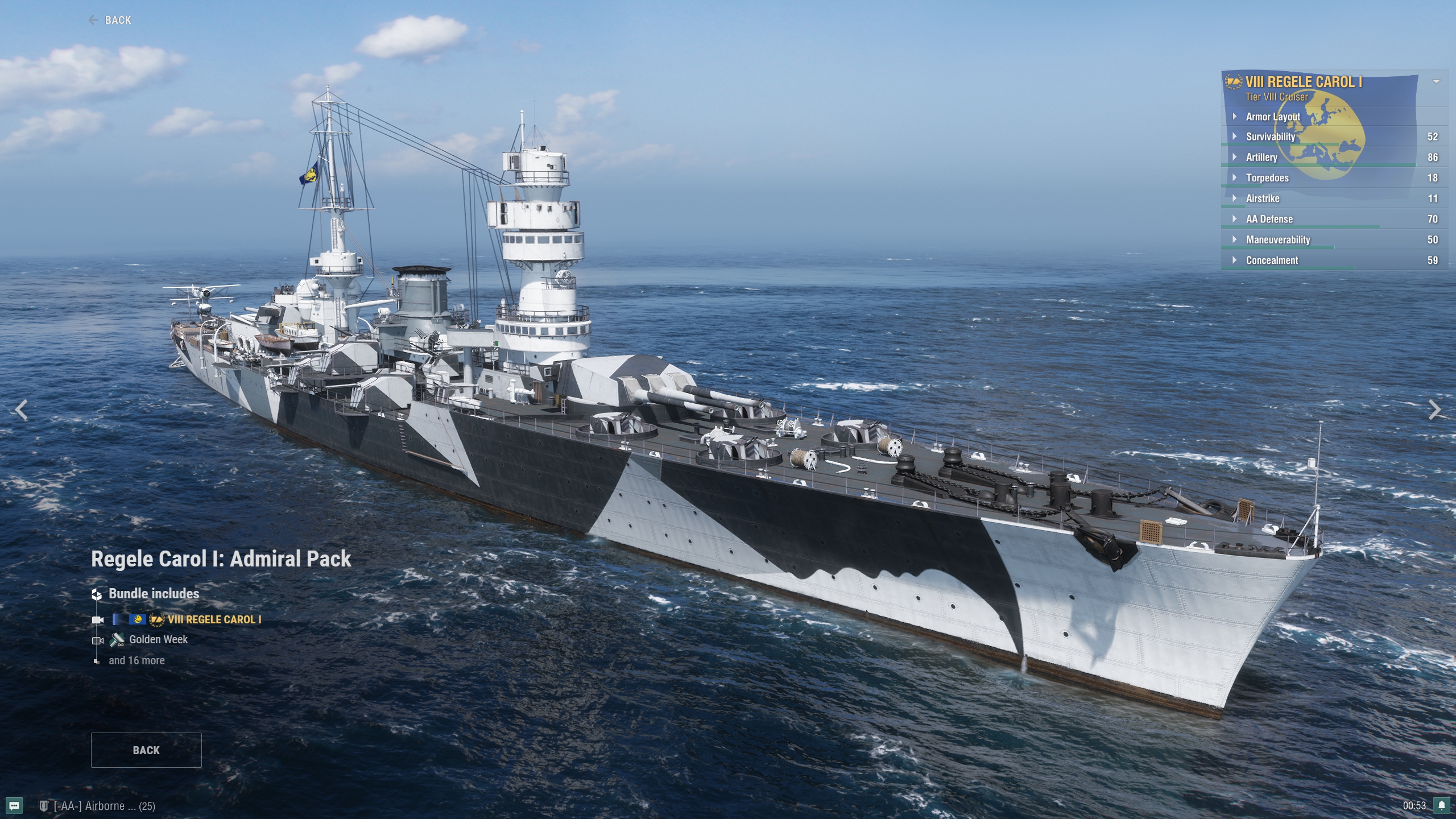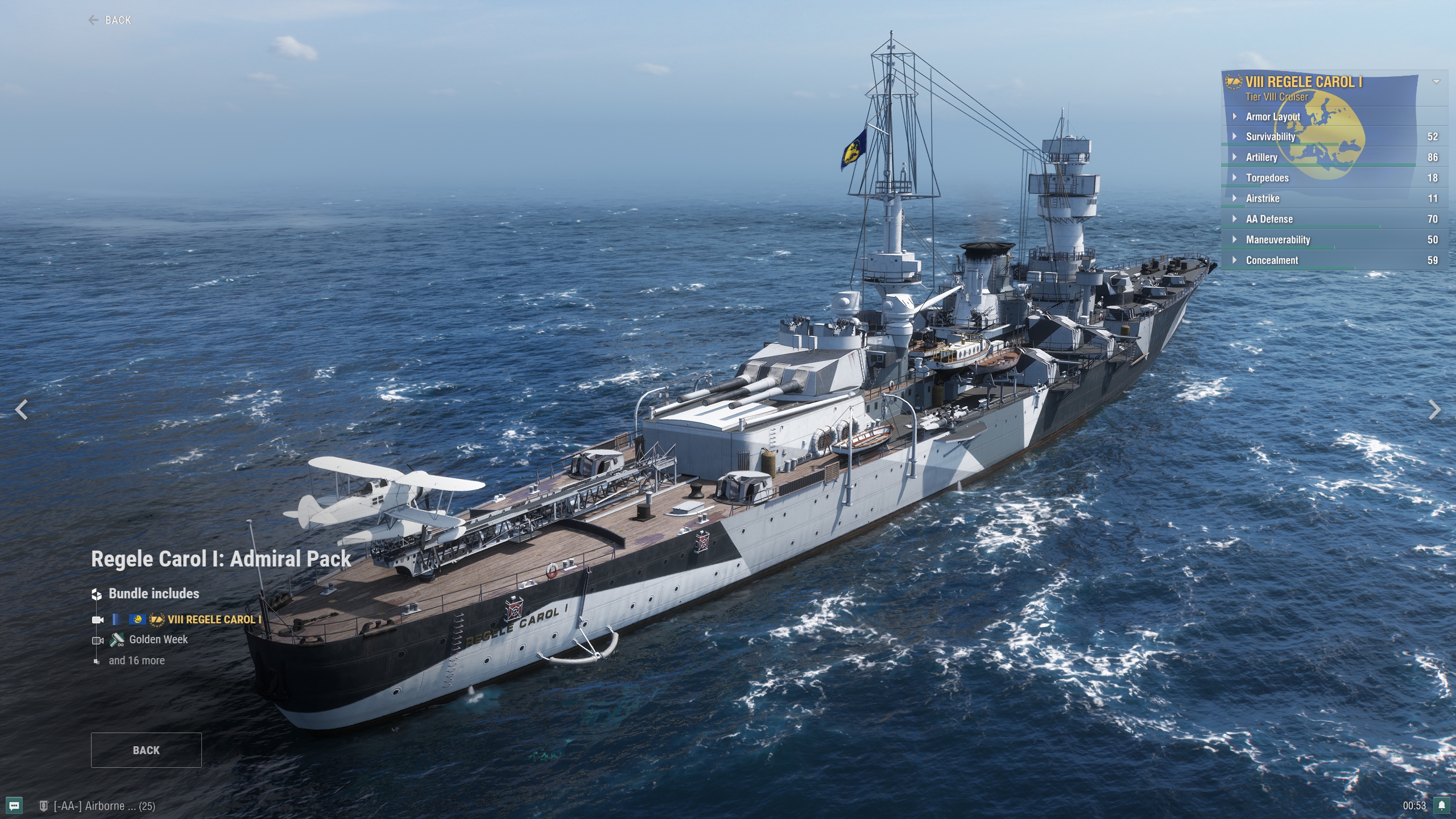 Fie va trebui să plătiți suma de 494.82 lei în schimbul căreia veți primi nava Regele Carol I, un căpitan cu 10 skill points, un drapel comemorativ, un camuflaj permanent și o mulțime de bonusuri economice, fie puteți să achziționați Golden Week Containers cu ajutorul dublonilor și să sperați că vă pică nava aceasta și nu alte bazaconii.