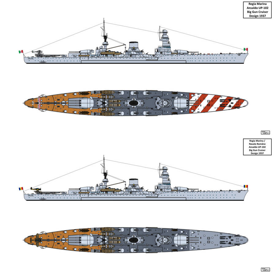 La o scurtă cercetare, pare să fie vorba de un design italian intitulat UP 102 care a fost propus către România în anul 1937, fiind încadrat în clasa de crucișător, dar cu un armament ceva mai potent, similar cuirasatelor din clasa Deutschland.
